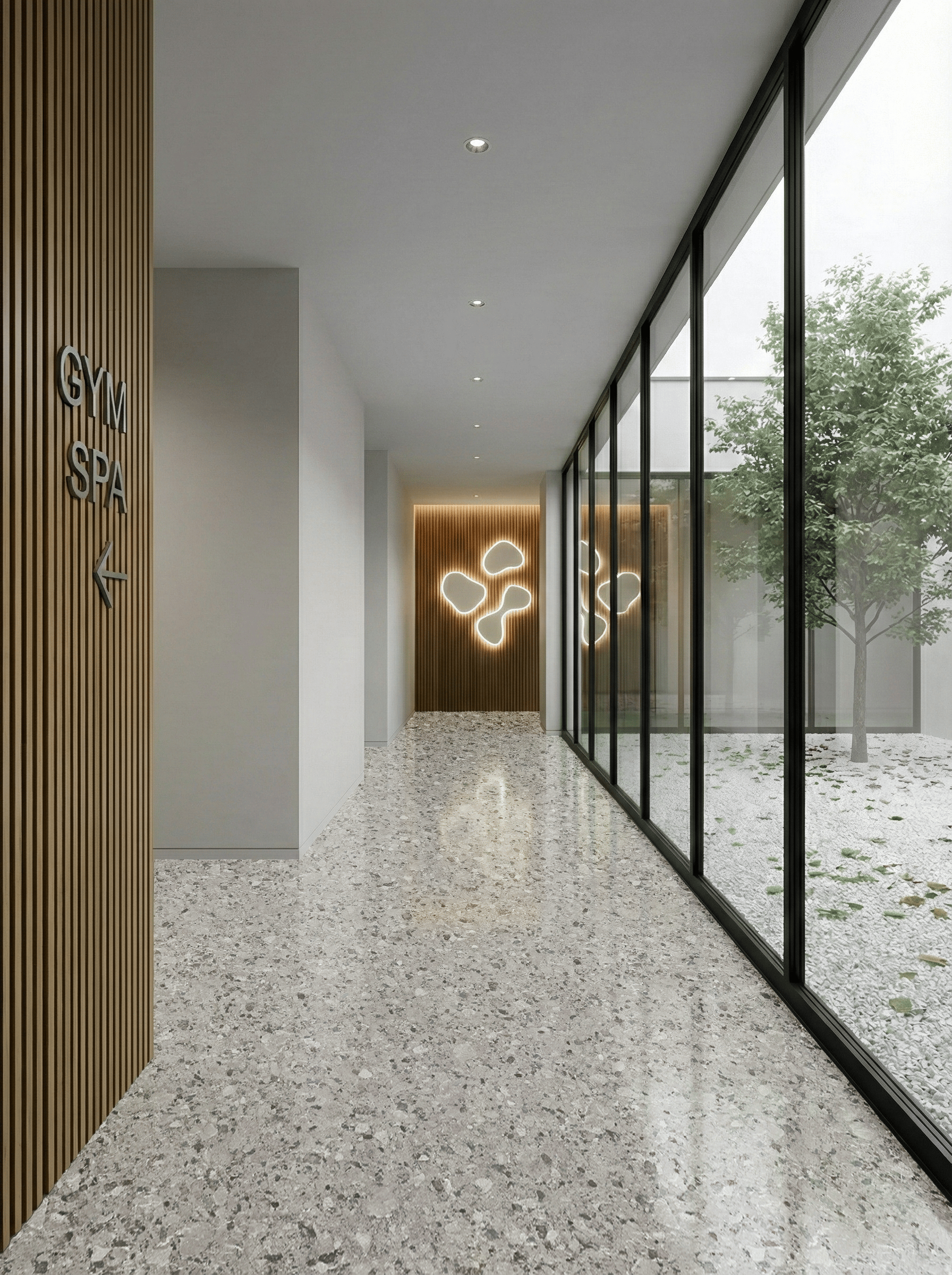 A modern flooring solution blending the classic modern look of quartz with the resilience and comfort of advanced materials.